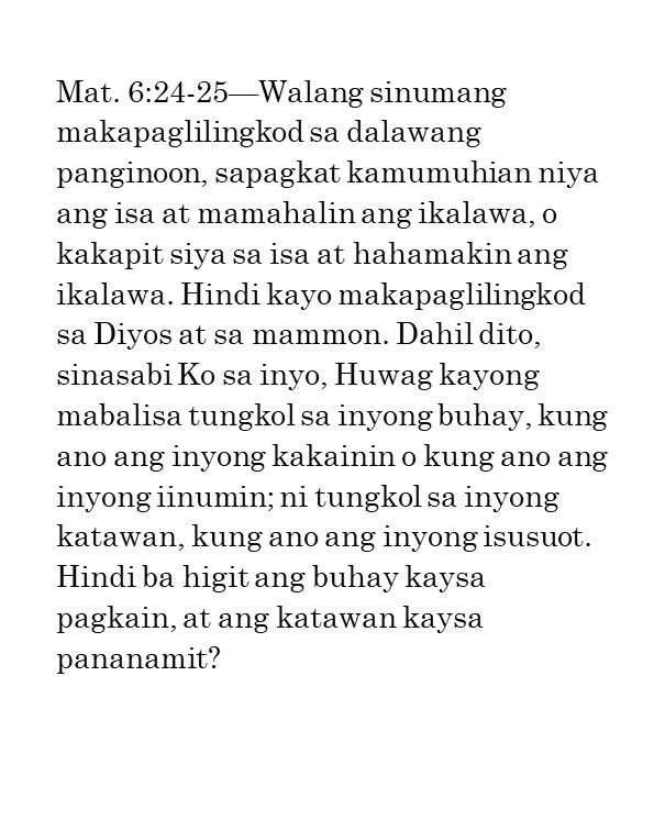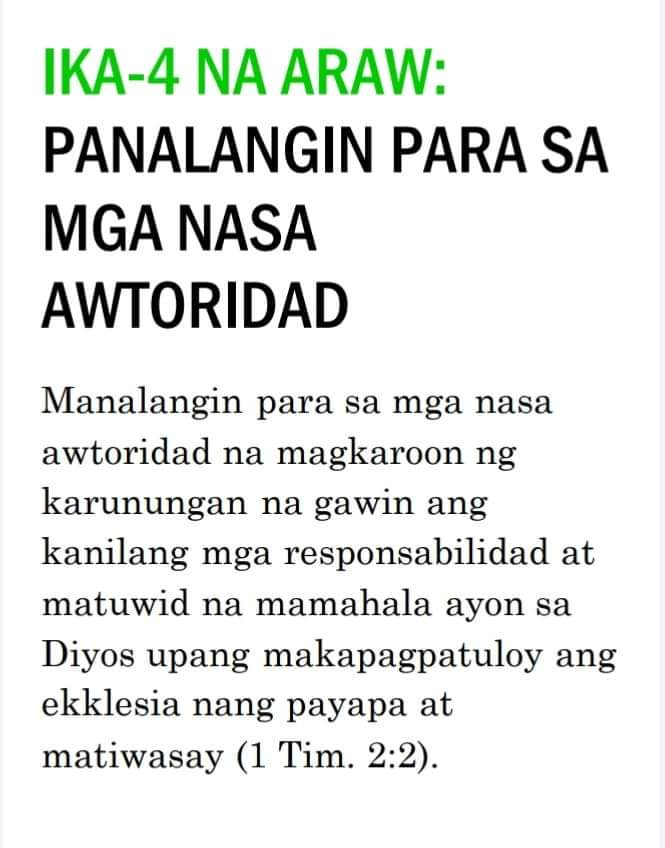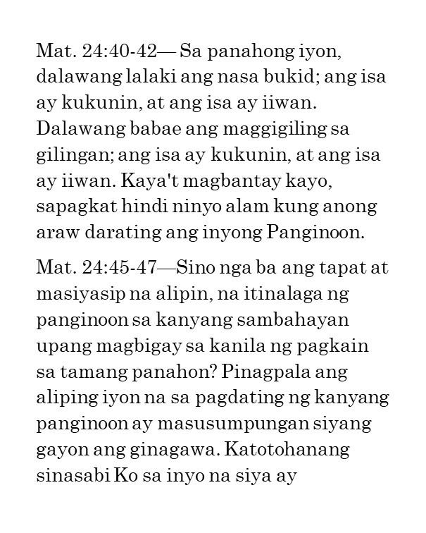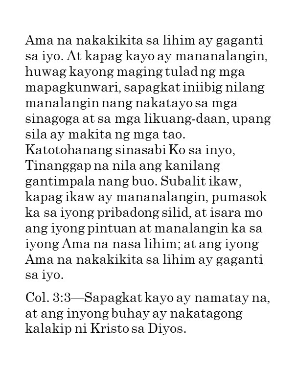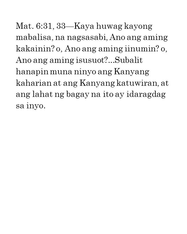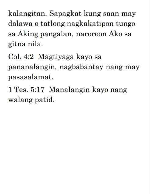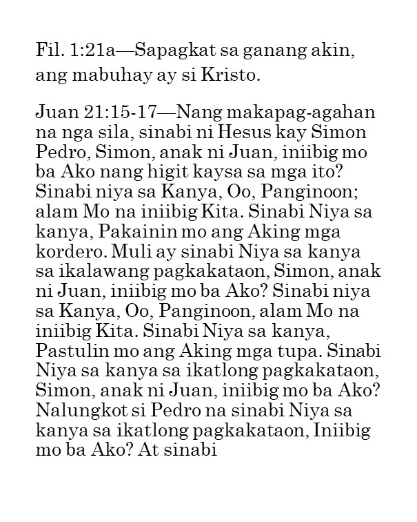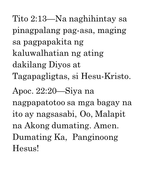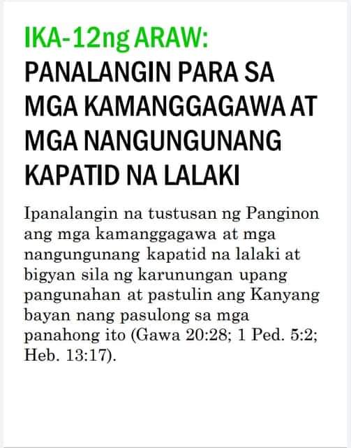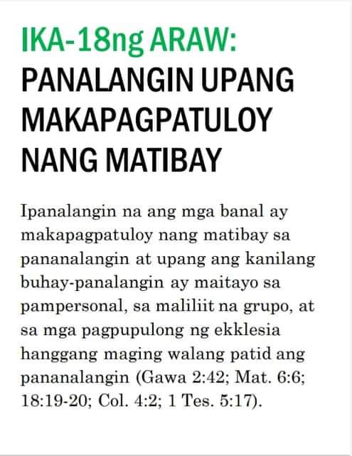 Ako’y naglagay ng mga bantay / sa iyong mga pader, O Herusalem; / Sila’y hindi tatahimik kailanman / Sa araw o sa gabi.—Isaias 62:6“Ang mga bantay na ito ay mga tao ng panalangin. Kailangan nilang magbantay nang walang tigil upang malaman kung may nangyayari ba at kung may nagaganap ay sisigaw sila. Ang isang tao ng panalangin ay dapat isang nagpapaalala sa Panginoon nang patuloy. Hindi ito gawain ng isang indibidwal o ng ilang tao; kailangan ang isang grupo ng tao upang manalangin sa ganitong paraan. “Sila’y hindi tatahimik kailanman sa araw at sa gabi.” Mga magkakasama ang mga ito na sama-samang nagbabantay, at sama-sama silang may natutuklasan, at sama-sama silang nananalangin nang walang patid sa Diyos. Ang kanilang panalangin ay hindi humihinto “hanggang sa maitatag Niya at gawing kapurihan ang Herusalem sa daigdig” (b. 7). Dapat tayong magtiyaga sa panalangin hanggang maitayo ang Katawan ni Kristo. Kailangan ng Diyos ang ating mga panalangin. Ninanais Niyang magkaroon tayo ng espiritu ng panalangin, ng atmospera ng panalangin, at ng susi sa panalangin. Mga kapatid, bumangon tayo at matuto tayong manalangin. Hanapin natin ang susi sa panalangin nang sa gayon ay matugunan natin ang pangangailangan ng Diyos ngayon.”
