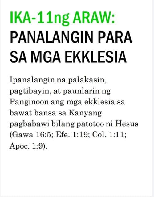 Pinasasalamatan natin ang Panginoon sa Kanyang mayamang panustos sa mga ekklesia at sa mga banal sa Kanyang pagbabawi na nagbigay-kakayahan sa napakaraming kapatid na mamagitan bilang isang tao nitong nakaraang buwan. Wala pang nangyaring gayong pandaigdig, buong umaga’t buong gabing pananalangin sa kasaysayan ng Kanyang pagbabawi. Bagama’t nadarama naming tapusin na itong koordinadong pagpapagal sa Abril 30, umaasa kami sa Panginoon na hindi lamang ito magiging isang panahon ng panalangin bagkus pananatilihin Niya tayong lahat na magpatuloy sa pagsulong sa ating personal na buhay-panalangin at sa pansama-samang ministeryo ng panalangin ng ekklesia.